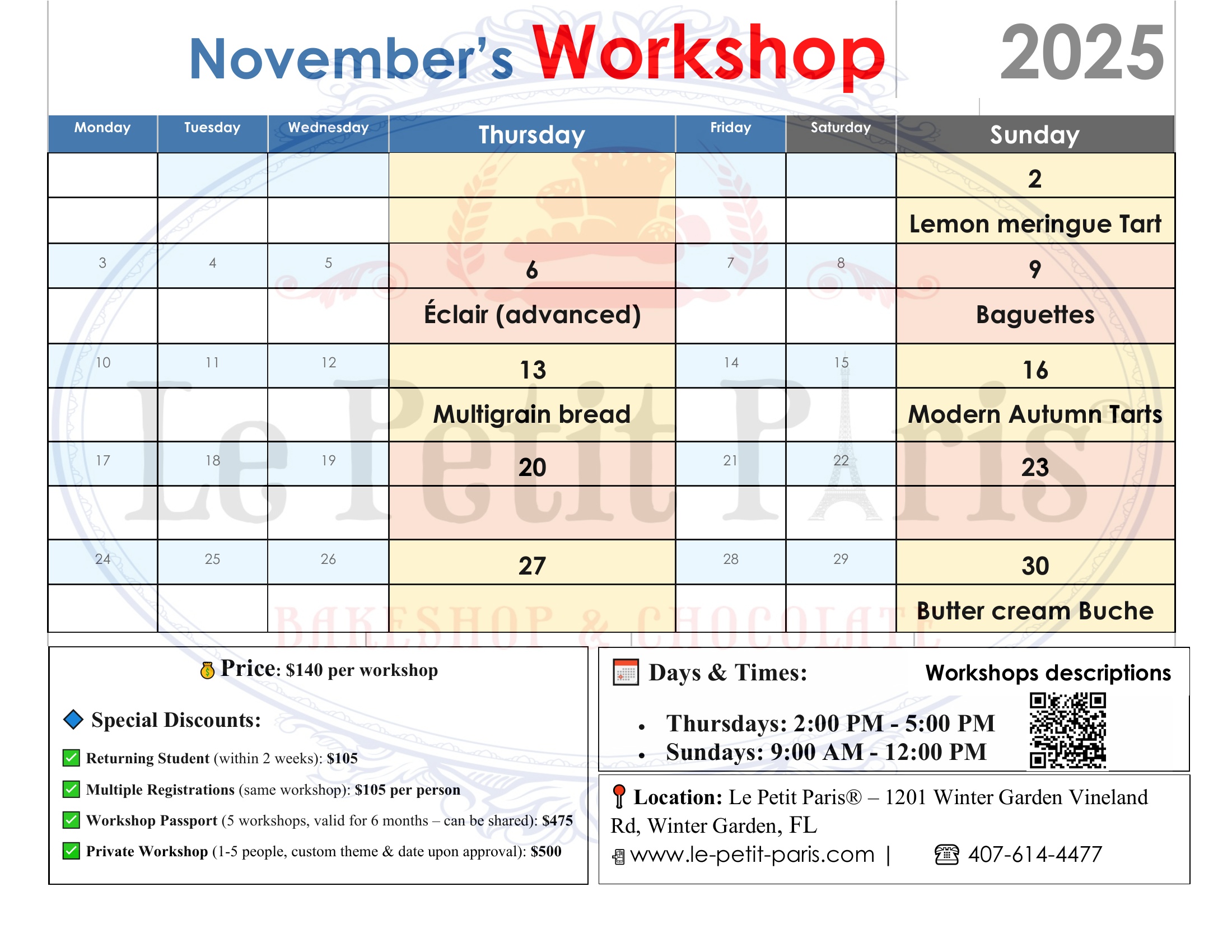 As the holidays approach, Le Petit Paris invites you to discover the magic of French pastry and bakery traditions. Our November workshops are all about comfort, flavor, and creativity — from artisan breads to elegant holiday desserts.