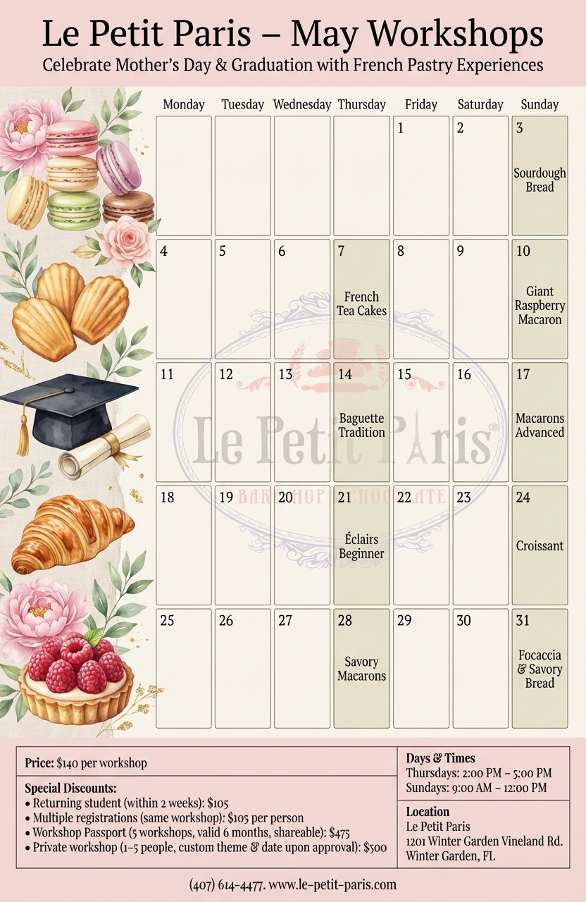 May at Le Petit Paris® is all about celebration, sharing, and refined French pastry experiences. From Mother’s Day to graduation season, this month highlights workshops that combine elegant techniques, seasonal creativity, and meaningful moments — because great baking is not only about skill, but also about creating memories.